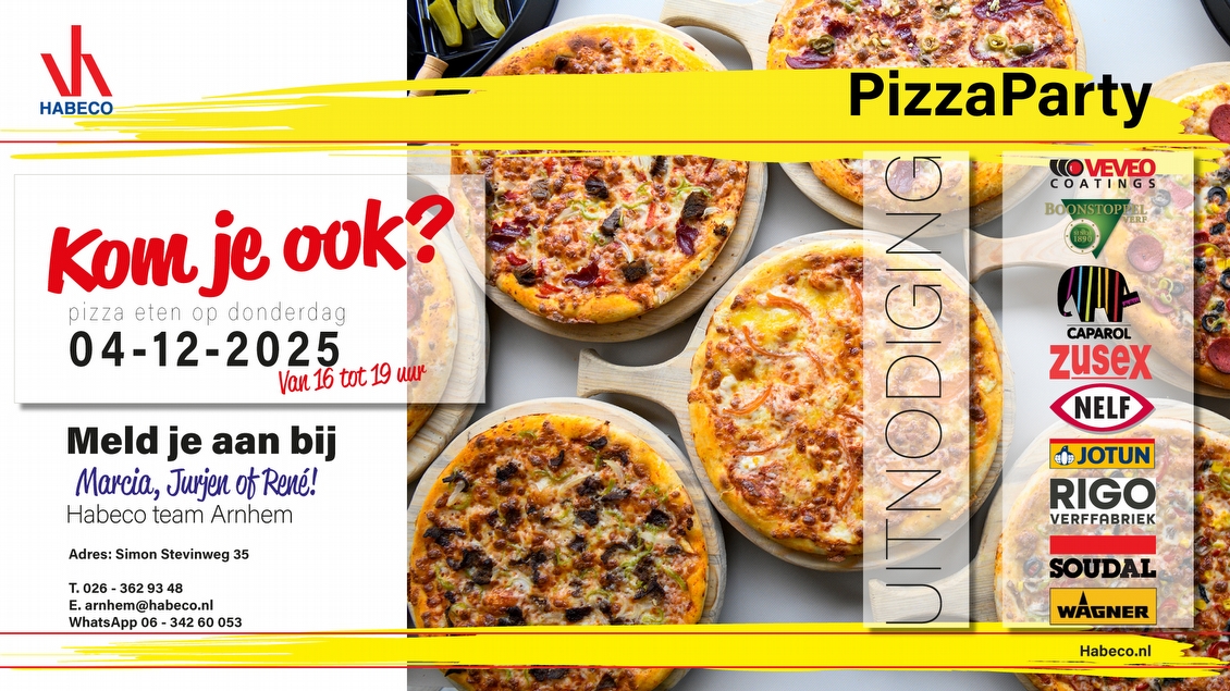 Ter plaatse worden de pizza bereid en rond gebracht. Ondertussen kan jij netwerken met onze leveranciers en met andere schilders uit Arnhem en omgeving.